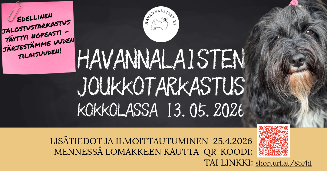 Havannalaisten joukkotarkastus Kokkolassa maanantaina 20.04.2026 Ilmoittautumiset 4.4.2026 mennessä Aika: maanantaina 20.04.2026 klo 12.30 – n.18.00. Eläinlääkäri ottaa max. 4 kuvattavaa koiraa päivässä. Eläinlääkäri tarkentaa aikataulun kun ilmoittautumiset on saatu. Tarkastava eläinlääkäri Kokko-Vet Oy / Taina Lehtonen. Osoite: Kansakoulukatu 24, 67200 Kokkola. Taina pystyy ottamaan kaikki rtg-kuvat, tekemään silmä- ja polvitarkastuksen sekä sydänkuuntelun. Lisätiedot ja ilmoittautumiset: https://docs.google.com/forms/d/e/1FAIpQLSc7b7ou_E9l4XET459ddIe4NmdMb2XGS-7sJa8NMJfKUu6hBA/viewform